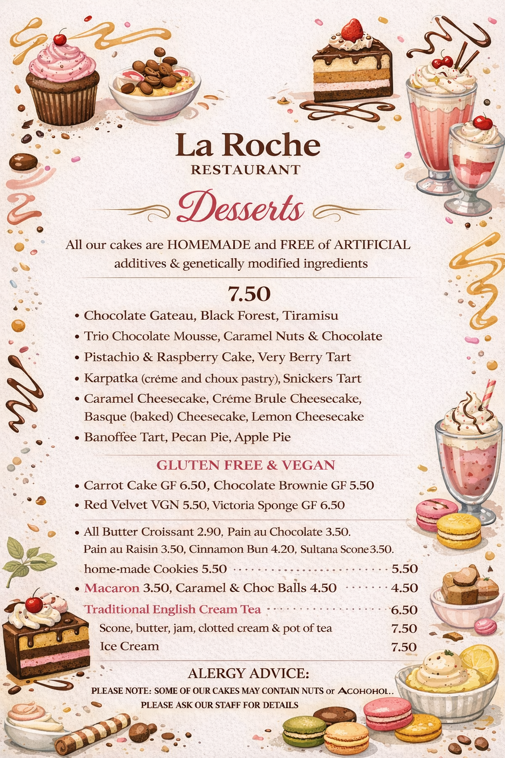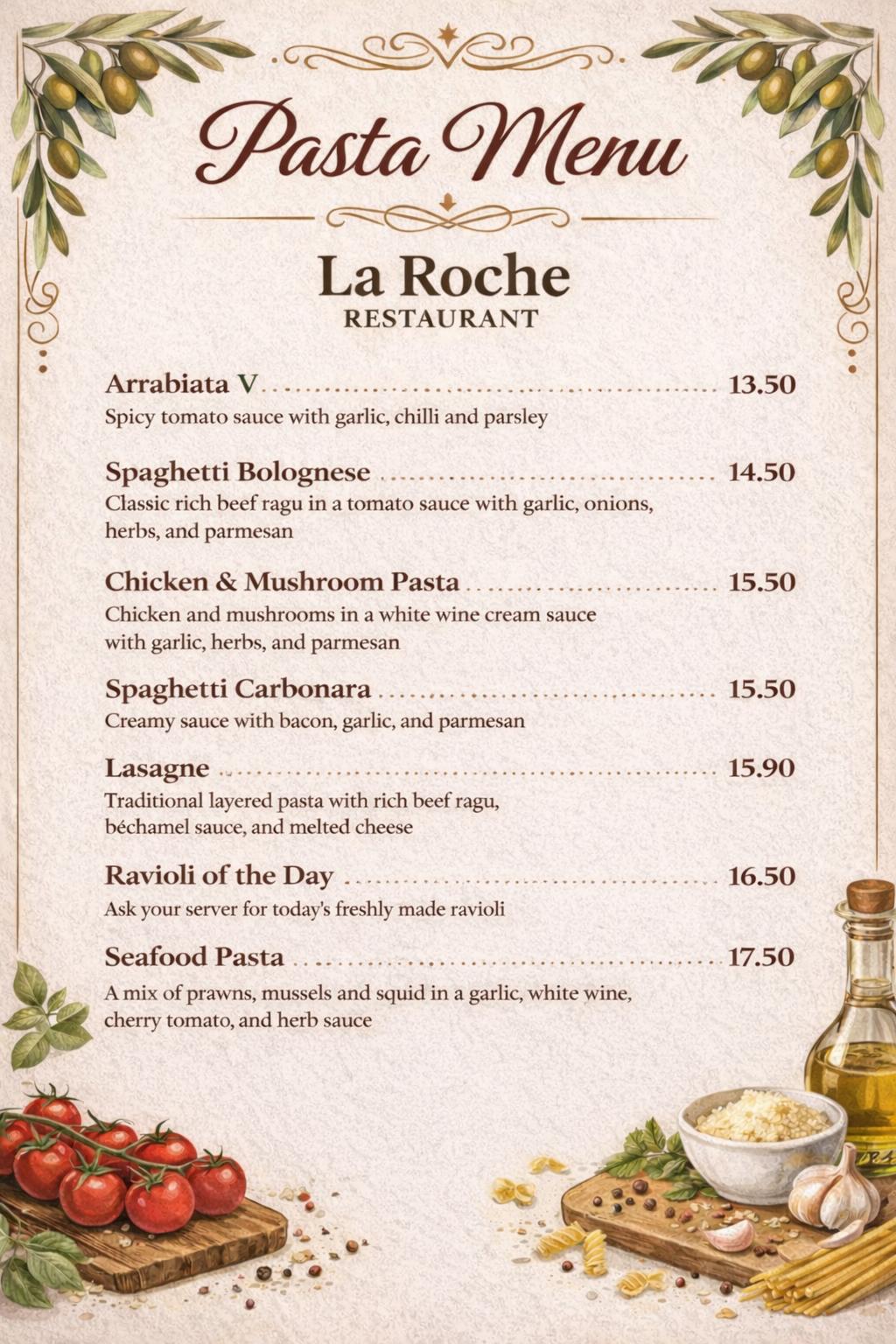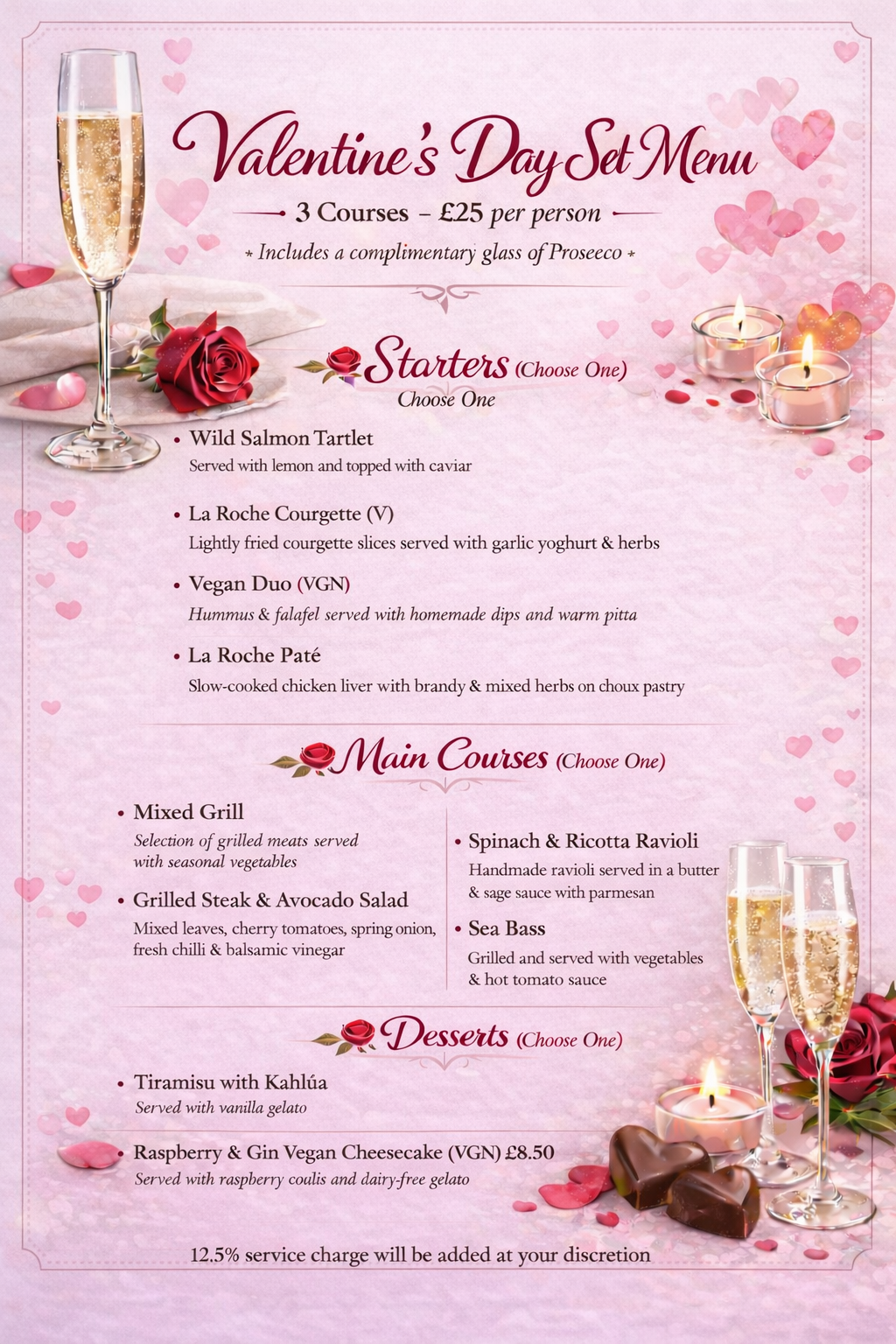 Menu La Roche Valentine's Menu We're already taking reservations, don't miss out! Breakfast Brunch Toasties Pasta Menu Dinner Kids Menu Desserts | Hot/Cold Beverages Alcoholic Drinks